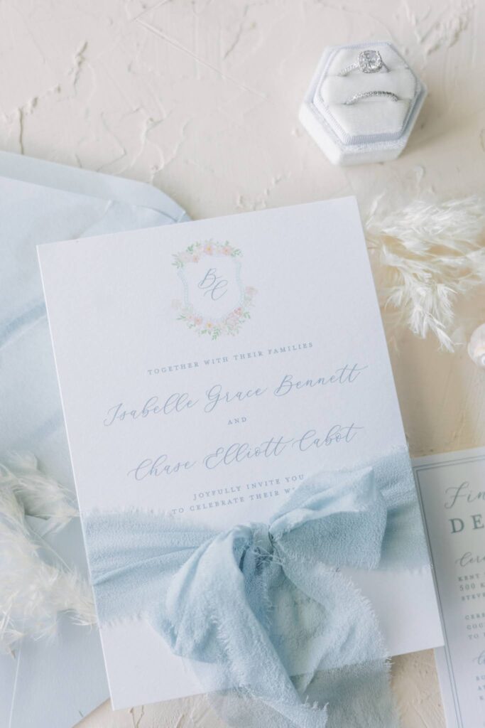 Luxurious details like wax seals and silk ribbon can help set the tone for an elegant wedding. A custom monogram or crest elevates the look further.