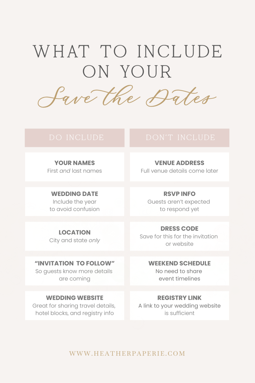 Send save the dates to everyone on your guest list, including close family members, friends, and anyone you’re confident you’ll invite. Remember, once a save the date is sent, it’s expected that the recipient will also receive a formal invitation. If you’re still finalizing your guest list, check out our post on how to make a wedding guest list for our best tips!