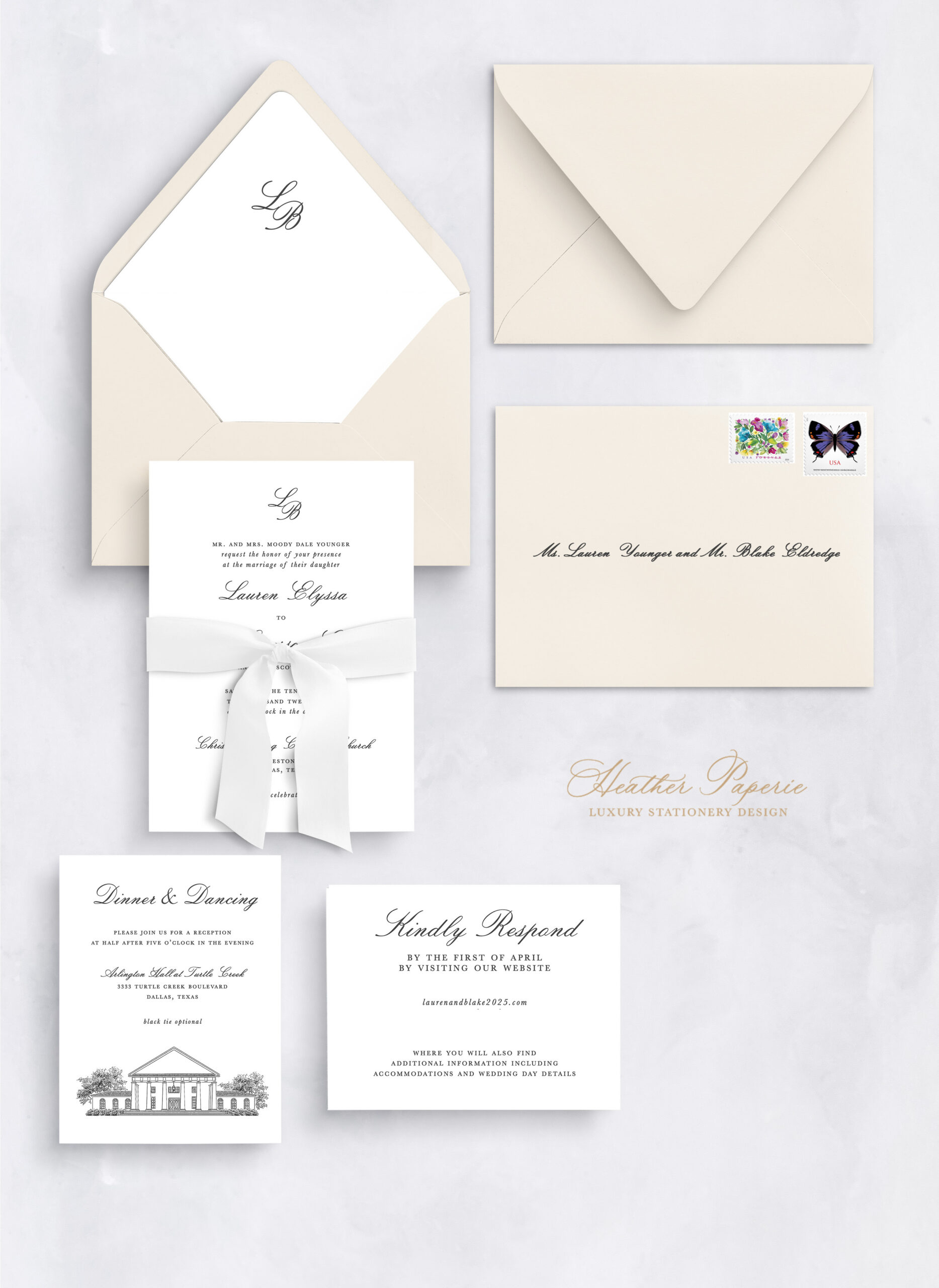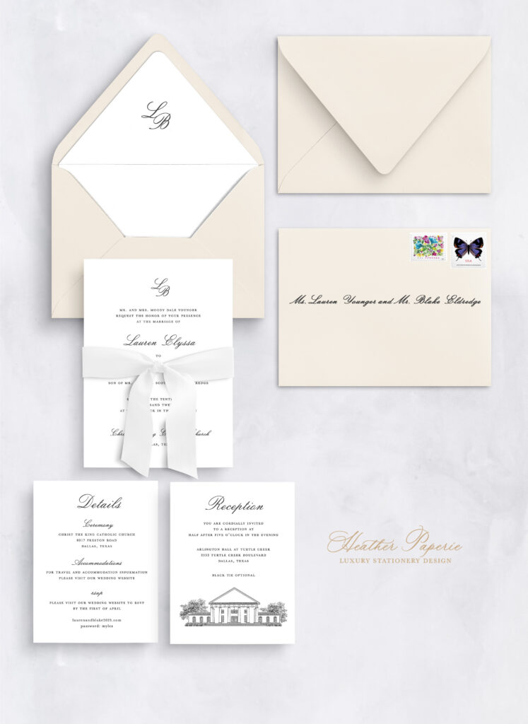 Planning a wedding at Arlington Hall at Turtle Creek, or another timeless venue? We’d love to help you design custom wedding stationery that feels beautifully personal. Reach out to start your design journey today.
